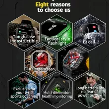 The ultimate smartwatch for outdoor enthusiasts and rugged adventurers, this rugged military smartwatch is designed to keep up with your toughest challenges. Equipped with a 2.1-inch AMOLED HD display, it delivers crystal-clear visuals with excellent brightness, perfect for reading in any light condition. Whether you’re hiking through the mountains or navigating through the city, this smartwatch ensures you’re always connected, safe, and informed.