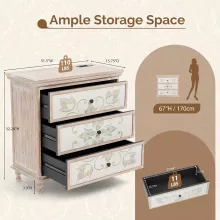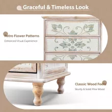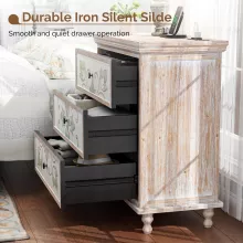 Made from sturdy pine wood and MDF board, this nightstand is built to last. Supported by solid wood legs, it offers excellent stability and can hold up to 110 lbs on the tabletop. Each drawer supports up to 11 lbs, providing a reliable storage solution for books, accessories, or nighttime essentials. The hand-fired finish enhances its rustic charm, while the intricately carved floral drawer fronts add a touch of artistry to your décor.