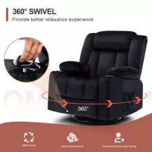 Experience pure relaxation with the 360° Swivel Recliner Rocker Chair – your perfect retreat after a long day. Designed for those who value comfort and modern style, this recliner blends relaxation and elegance seamlessly. Its overstuffed backrest, padded armrests, and plush seat cushion perfectly contour to your body, offering the support and softness you deserve. Whether you’re watching TV, reading a book, or simply taking a break, this chair transforms your living space into a cozy haven.