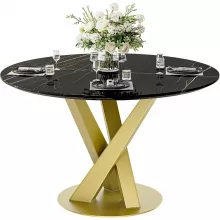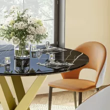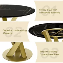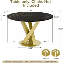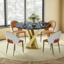 The elegant faux marble tabletop rests on a bold, gold pedestal base with an X-shaped carbon steel frame. This combination of materials creates a perfect balance between modern sophistication and lasting stability. The smooth, water-resistant surface is easy to wipe clean—ideal for busy households or those who love entertaining without the hassle of upkeep. Measuring 47.24” in diameter and 29.53” high, it comfortably seats four people, fitting beautifully into kitchens, dining rooms, or apartments with limited space.