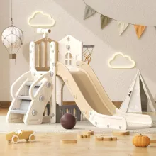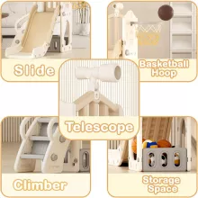 This multifunctional playset includes an extra-long slide, a safe climbing ladder with sturdy handrails, a fun basketball hoop with a ball, a pretend telescope for imaginative play, and a convenient storage space for toys. The gentle slope and wide slide design ensure a smooth, safe ride every time, while the hide-and-seek windows add excitement and spark creativity.