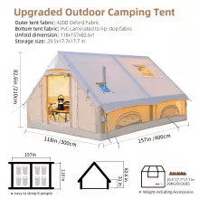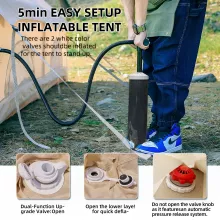 Setting up camp has never been easier. Thanks to its inflatable frame, you can forget about struggling with poles and ropes. Just pump it up, and your comfortable, stable shelter is ready within minutes. The durable, waterproof materials keep the interior dry even in heavy downpours, while the breathable structure allows for airflow, so you stay cool and cozy all night long.