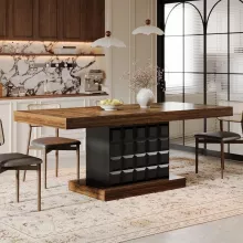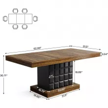 Bring style and warmth to your dining space with this 63″ farmhouse-inspired wooden dining table. Its rectangular top in a rich brown finish pairs beautifully with a bold, black pedestal base featuring geometric relief detailing. The result? A dining centerpiece that blends modern sophistication with rustic charm, making it the perfect gathering spot for family dinners, friendly get-togethers, or festive celebrations.