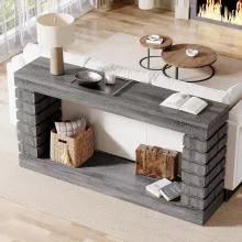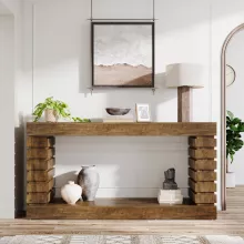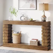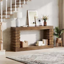 This console table features a sleek rectangular top and two spacious lower shelves—perfect for storing and displaying your favorite items. Showcase framed photos, books, plants, or decorative accents while keeping your space neat and organized. Its narrow 11.8-inch depth makes it ideal for compact areas without sacrificing style or storage. The warm brown finish and clean lines create a timeless, vintage look that fits effortlessly into modern, rustic, or industrial interiors.