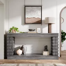 Elevate your home décor with this stunning 70.8-inch long wood console table, designed to blend industrial charm with everyday practicality. With its rich wood tones, geometric base, and slim silhouette, this table adds character and warmth to any space. Whether you place it behind a sofa, in your entryway, or along a hallway, it becomes an instant focal point that speaks of style and sophistication.