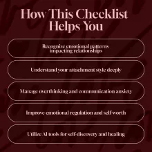 This checklist is packed with insightful prompts and tools to help you spot the signs of anxious attachment style. Here’s what you’ll find: