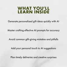 Unlike other digital resources that offer broad, one-size-fits-all gift suggestions, the AI Gift Genie helps you tailor gift ideas to the unique preferences of the recipient. With clear instructions on how to craft the right prompts and avoid common pitfalls, you’ll be able to personalize AI suggestions to ensure every gift is meaningful and thoughtful. Plus, the guide includes bonus tips for using AI to plan events, create surprises, and enhance every aspect of your gift-giving experience.