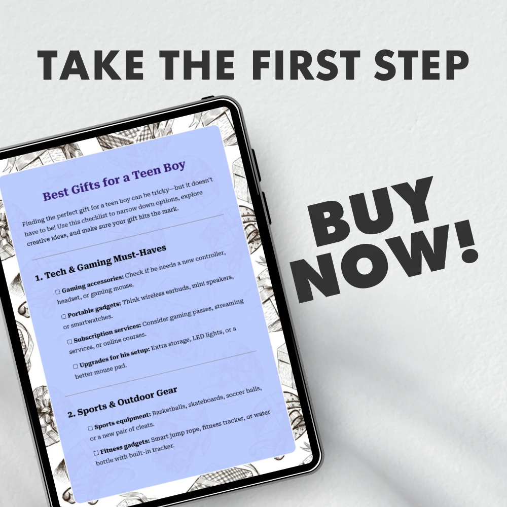 Make your next gifting occasion effortless and enjoyable. Download the Best Gifts for a Teen Boy checklist now and start exploring clever, creative, and personalized ideas that will make his day unforgettable. Click “Add to Cart” and get instant access to the ultimate teen boy gift guide today!