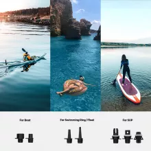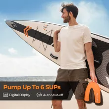 Set your desired time from 1 to 10 minutes, and the pump will handle inflation or deflation automatically, displaying the countdown clearly. With dual power options — use the rechargeable battery or plug into your car’s 12V DC port — you’re covered in any scenario. Six interchangeable nozzles ensure compatibility with virtually every major SUP and inflatable brand.