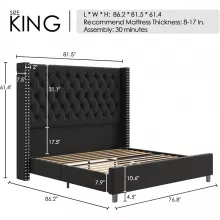 Experience luxury and comfort with our Elegant King Size Bed Frame with Tall Velvet Headboard. This stunning bed frame stands at an impressive 61.4 inches tall, offering a grand presence in your bedroom while providing a feeling of shelter and relaxation. Designed to fit mattresses ranging from 8 to 17 inches, this velvet upholstered platform bed is both stylish and practical, enhancing your sleeping environment with a touch of class.