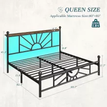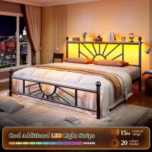 Upgrade your bedroom with our Elegant Metal Queen Bed Frame, where modern design meets ultimate functionality. This stylish bed frame features a stunning headboard and footboard with a unique sunflower-inspired design, adding a touch of elegance to any decor. With an easy-reach storage shelf integrated into the headboard, keeping your essentials like books and glasses close has never been easier.
