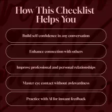 This checklist is designed to help you build more meaningful connections in both personal and professional settings. Whether you’re trying to make a great first impression, ace a job interview, or engage with others in social situations, these simple eye contact strategies will help you: