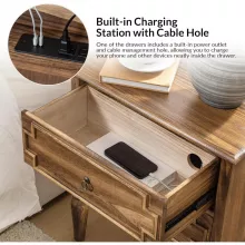 The standout feature of this nightstand is its ingenious built-in charging station. Tucked neatly inside, you’ll find a powerful hub with USB ports, Type-C ports, and three-prong outlets. This means you can charge all your essential devices in one central, organized location, freeing your tabletop from a tangled mess of cords. This modern convenience is seamlessly integrated into a piece that boasts classic farmhouse beauty, complete with decorative wood trim and stylish round ring pulls, making it special both in function and form.