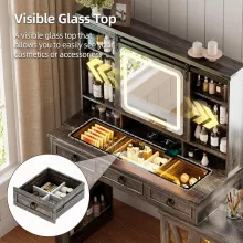 With 6 drawers, 10 open shelves, and 2-tier racks, you’ll never run out of space for your makeup, skincare, perfumes, and beauty tools. The clear glass top adds a touch of sophistication while allowing you to easily see your essentials at a glance. This vanity desk is equipped with a built-in charging station featuring a USB port, Type-C port, and wireless charging pad—keeping your devices powered while you get ready. The smart motion sensor light adds a touch of convenience by automatically lighting up when you approach and turning off when you leave.