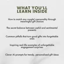 Inside, you’ll explore the heart behind engagement traditions and learn how to match your gift to the couple’s unique story. From timeless gestures to trendy AI-powered ideas, every page is crafted to help you give with intention—and confidence.