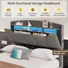 The bed’s upholstered headboard combines comfort and practicality with a double-tier shelf and hidden compartment—perfect for books, accessories, or personal items. On each side, handy storage pockets keep your nighttime essentials like phones, remotes, or glasses within arm’s reach. With its sleek, modern look, this bed enhances any bedroom décor with a touch of luxury.