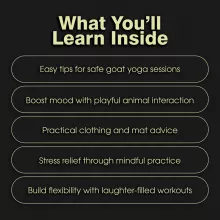 This checklist is perfect for anyone curious about goat yoga, whether you’re brand-new to yoga, a fitness enthusiast looking for a playful twist, or someone who loves animals and wants to try something different. It’s designed to be clear, simple, and welcoming, making goat yoga accessible to all.