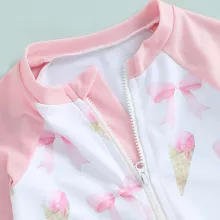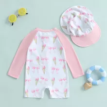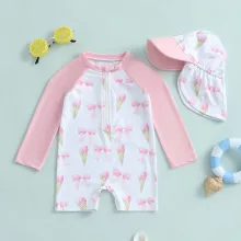 Let your little one make a splash in style with this charming 2-piece rash guard swimsuit set for baby and toddler girls. Designed with playful strawberry and ice cream prints, a sweet bow detail, and vibrant colors, this swimwear set is the perfect combination of fashion and function for sunny days at the beach or pool.