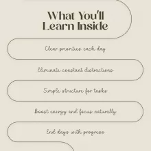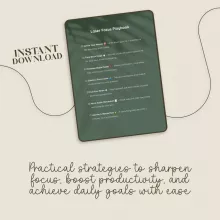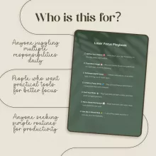 The Laser Focus Playbook is your step-by-step digital download designed to help you cut through noise, sharpen your attention, and get more done in less time. If you’ve ever found yourself struggling with distractions or wasting hours on tasks that don’t move you forward, this checklist is your solution. Packed with easy-to-follow strategies, it shows you exactly how to stay focused and avoid distractions so you can make each day count.