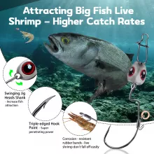 Unlike traditional hooks that kill or damage your bait, these hooks gently secure shrimp by their shell, keeping them full of life and energy. When your bait moves naturally, it draws in predators fast. The glow-in-the-dark design adds extra attraction in low light or murky waters, making it ideal for night fishing or deep-sea angling. Whether you’re targeting snook, redfish, or bass, you’ll have a serious edge with hooks that help your bait stay active longer.