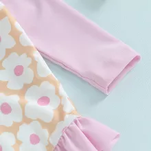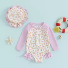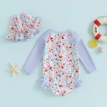 Get your little one ready to make a splash in style with this charming long sleeve toddler swimsuit romper. Designed for active baby girls, this swimwear is more than just cute – it’s protective, practical, and made for play. With a sweet floral patchwork design and delicate ruffle details, this bathing suit adds a touch of fun to sunny days by the beach or pool. The included matching swim cap completes the look while helping to keep her hair out of her face as she plays in the water.