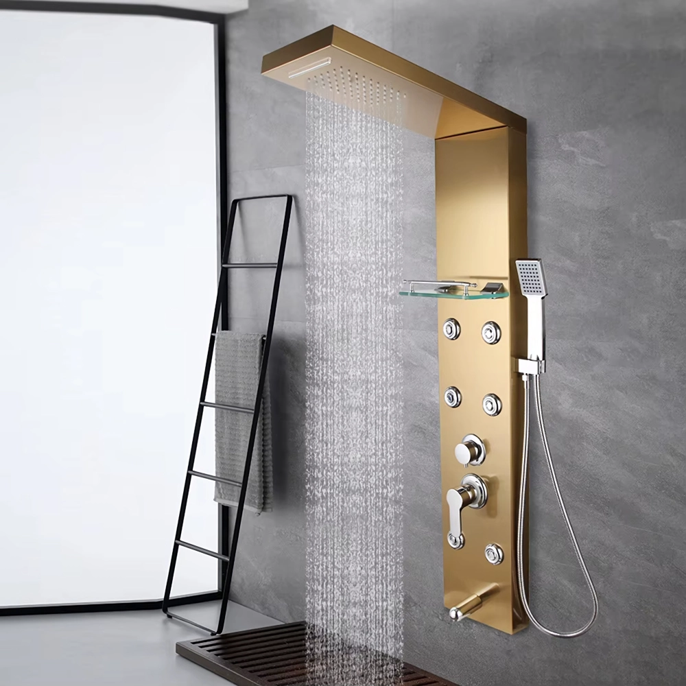 Crafted from premium brass and stainless steel with a sleek brushed finish, this wall-mounted shower panel blends durability with sophistication. The digital screen accurately displays the water temperature, ensuring the perfect warmth for your comfort and safety. Experience the sensation of rainfall from the overhead shower, complemented by powerful body jets and a convenient hand shower for personalized control. The built-in shelf adds practical elegance, keeping your essentials within easy reach.