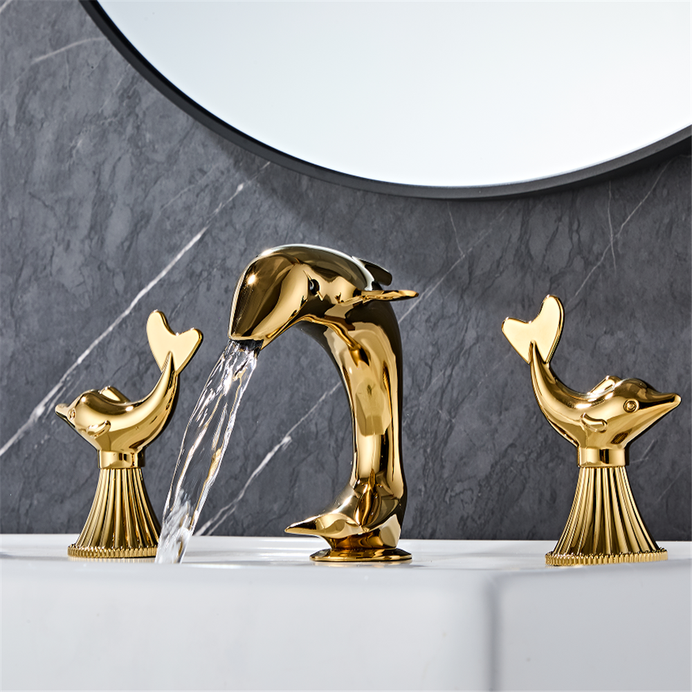 Transform your sink area into a statement of sophistication with this luxury dolphin-inspired gold bathroom faucet. Crafted with exquisite attention to detail, this widespread basin mixer combines artistic design with everyday practicality. Its elegant brushed gold finish captures the light beautifully, adding a warm, golden glow that enhances any bathroom décor. Perfect for master bathrooms, guest suites, or powder rooms, this faucet is where modern function meets timeless charm.