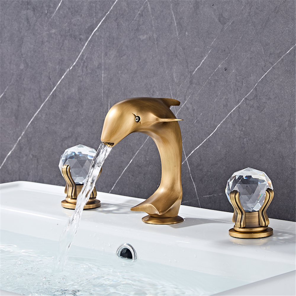 Designed for an 8-inch widespread mount, this faucet features dual handles for precise control of hot and cold water. The solid brass body ensures lasting durability, while the ceramic valve core guarantees smooth operation and prevents leaks. The classic dolphin shape adds a touch of playful luxury, making every wash a graceful experience. With its balanced design and easy deck-mounted installation, this piece fits seamlessly into any bathroom setting.