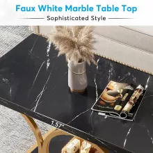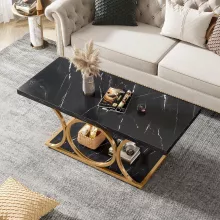Bring contemporary elegance into your home with this Modern 2-Tier Rectangle Coffee Table. Designed to impress, it features a luxurious black faux marble top paired with sleek gold geometric metal legs. This stunning combination effortlessly blends modern style and timeless charm, making it the perfect centerpiece for your living room, apartment, or studio.