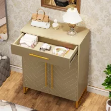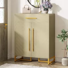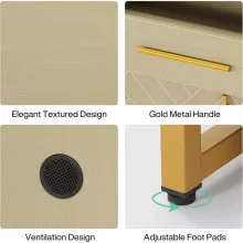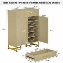 Crafted from durable engineered wood and supported by a sturdy metal base, this shoe cabinet ensures long-term reliability. The gold handles, smooth-sliding drawer, and soft-close doors provide a premium touch. Its enclosed design keeps dust away, while built-in rear ventilation holes maintain freshness for your shoes.