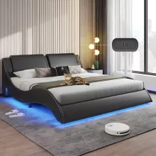 Transform your bedroom into a modern retreat with this Queen Bed Frame with LED Lights and Charging Ports. Designed for those who crave both luxury and practicality, this platform bed combines sleek aesthetics with advanced functionality. The under-bed RGB LED lighting system creates a stunning atmosphere, allowing you to choose from over 60,000 color options controlled via app or remote. Whether you’re winding down with soft ambient light or syncing the LEDs to your favorite music, your bedroom becomes a personalized haven of comfort and creativity.