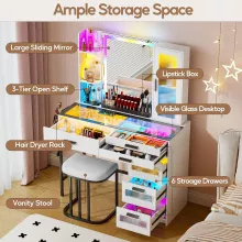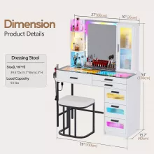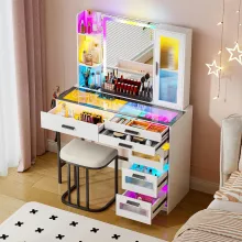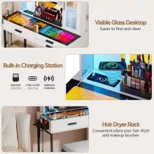 Crafted with a sleek glass top and a modern aesthetic, this vanity perfectly blends style and functionality. It features a wireless charging pad along with USB and Type-C ports for convenient device charging while you get ready. The six spacious drawers offer ample room to organize your beauty essentials, jewelry, and accessories. Plus, the included comfortable makeup stool completes your perfect beauty station setup.