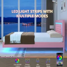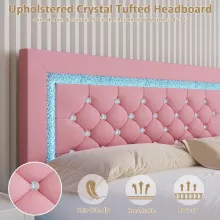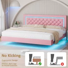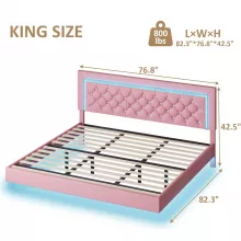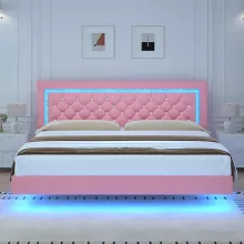 Pink Floating Platform Bed with LED Lights and Diamond Tufted Headboard