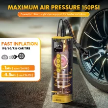• Powerful 150PSI Output – Inflates standard tires fast and efficiently.