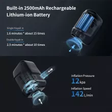Roughly the size of your palm and weighing under 1 lb, this compact powerhouse delivers up to 12kPa (1.7 PSI) of high-pressure airflow at an impressive rate of 142L per minute. Thanks to advanced turbocharging technology and a high-speed motor, you can fully inflate a double-sized kayak in just 150 seconds — all without lifting a finger beyond pressing the power button.