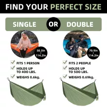 - Choose Your Size: Single hammock (9 ft x 4.5 ft) for solo travelers or Double hammock (10 ft x 6.5 ft) for sharing or extra room.