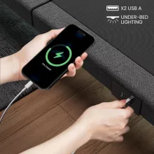 Featuring a dual-motor system, the head adjusts up to 65° and the foot up to 45°, giving you perfect positioning for better circulation, reduced snoring, or zero-gravity relaxation. Built from durable metal in a sleek dark grey and black finish, the frame combines strength and style effortlessly. The under-bed LED lighting adds a gentle glow for nighttime convenience, while USB charging ports keep your devices within reach as you relax.