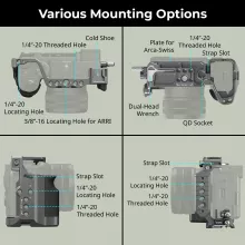 - Multiple mounting interfaces including 1/4″-20 threads, ARRI 3/8″-16 holes, and a cold shoe mount for mics, lights, and handles.