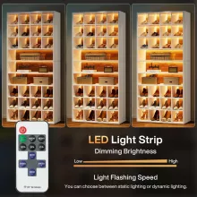 This shoe cabinet features a beautiful white finish combined with a heavy-duty engineered wood construction that ensures durability and longevity. What truly sets this piece apart is the customizable LED ambiance. Equipped with a wireless RF remote, you can easily adjust the brightness, switch between lighting modes, and control the speed, allowing you to create a welcoming environment for your shoes or even using it as a display for decorative items.