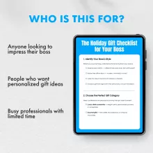 Choosing a holiday gift for your boss can be a tricky task, but with the Holiday Gift Checklist for Your Boss, you’ll have all the tools and insights you need to find something thoughtful, personal, and professional. This easy-to-follow guide ensures you select a gift that reflects your boss’s personality and style, making this holiday season extra special. Whether you’re looking for something luxurious, relaxing, or creative, this checklist has you covered. Download this essential guide today and impress your boss with the perfect gift!