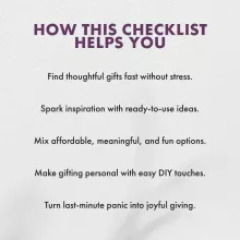 Unlike generic gift lists, this checklist blends creativity, sentiment, and practicality—focusing on experiences and small gestures that leave a lasting impression. It’s beautifully organized, easy to follow, and packed with inspiring ideas that balance speed and sincerity.