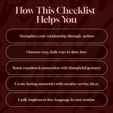 Unlike other general love language resources, this checklist focuses exclusively on one of the most impactful love languages—acts of service. Each idea is tailored to be practical, easy to implement, and thoughtful, making it simple for you to show love even on the busiest days. Whether it’s packing their lunch or planning a spontaneous “service date,” the unique ideas in this guide will ensure your actions speak louder than words. It’s more than a checklist—it’s a guide to creating lasting memories and deepening your connection with someone special.