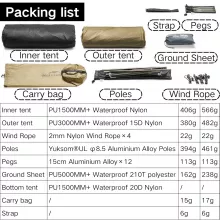 Crafted from tough 15D nylon and supported by strong aluminum alloy poles, this tent sets up quickly and stands up to unpredictable outdoor elements. Its double-layer construction and waterproof coatings—1500-2000 mm on the outer shell and over 3000 mm on the tent floor—ensure you stay dry through surprise downpours or damp ground. Whether you’re heading out for a weekend trip or a multi-day hike, this tent is made to move with you.