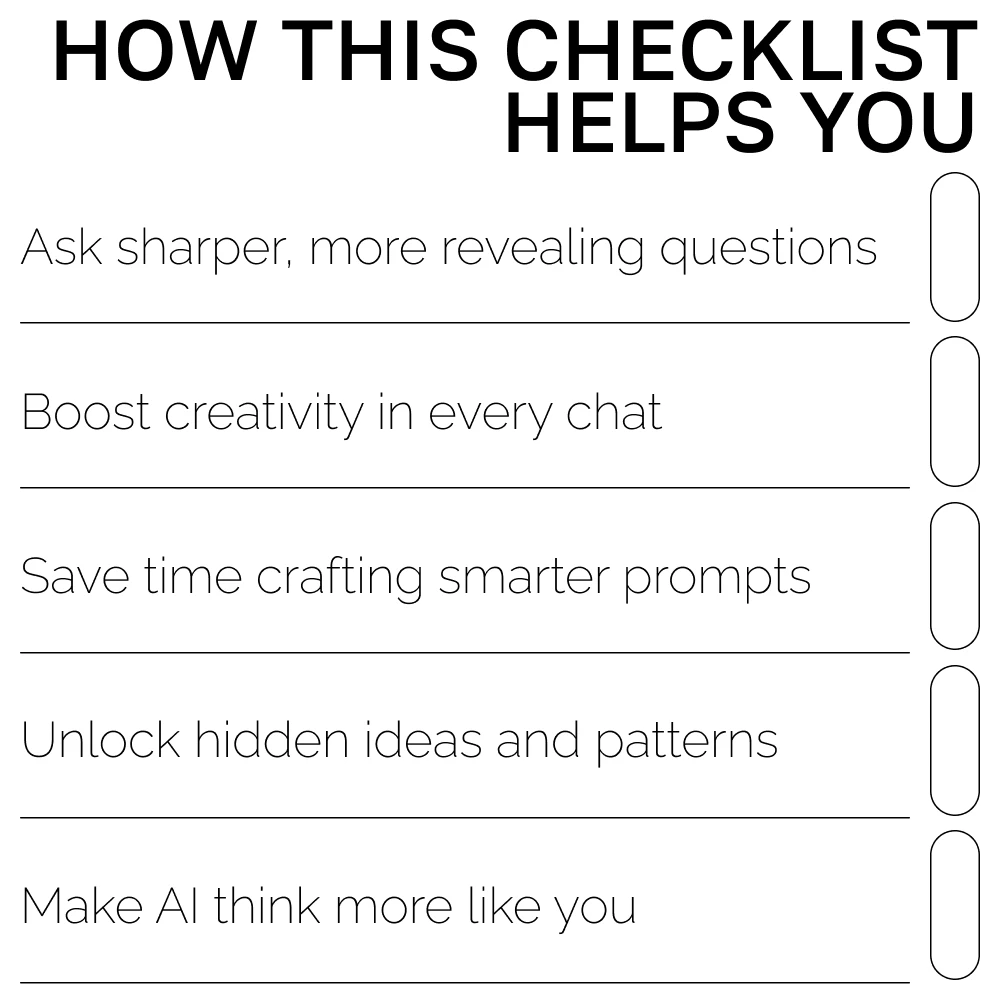 This checklist is perfect for creators, learners, and curious minds who want to make AI their thinking partner. If you use AI to brainstorm, research, or create—and you’re ready to go beyond basic prompts—this is made for you.