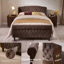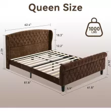 Transform your sleeping space into a luxurious retreat with our Upholstered Queen Bed Frame with Wingback Headboard. This stunning sleigh bed combines classic elegance with modern comfort, creating a beautiful centerpiece for any bedroom. The bed frame is adorned with intricate scrollwork and deep button tufting, offering a sophisticated touch that enhances the overall decor of your home.