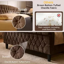 This exquisite bed frame features a 51.2-inch wingback headboard that not only provides excellent back support for reading or lounging but also adds a grand sense of style to your room. Upholstered in soft, luxurious chenille fabric, the bed feels as good as it looks, making it the perfect spot to unwind after a long day. With dimensions measuring 87.8 inches long, 61.8 inches wide, and 42.1 inches high, it can effortlessly accommodate a queen mattress without the need for a box spring, keeping your space looking clean and uncluttered.