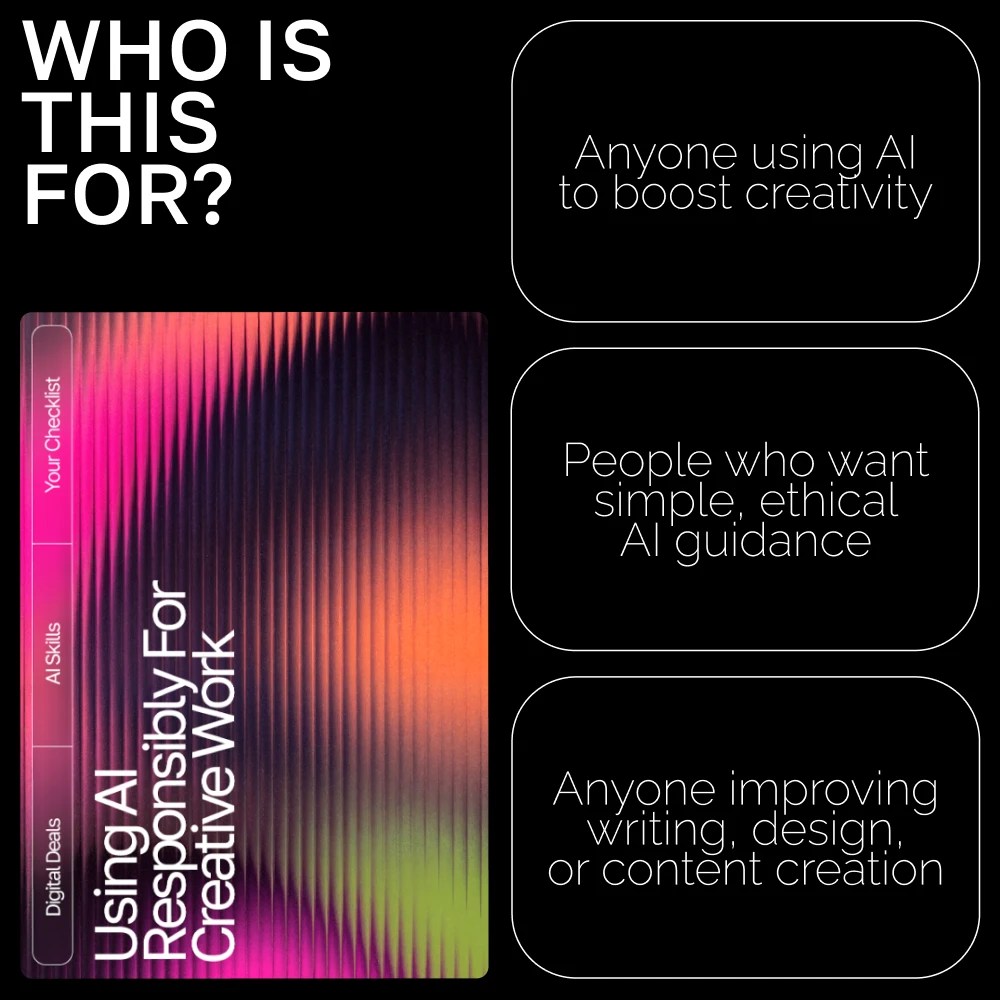 This digital checklist is perfect for writers, artists, designers, content creators, small business owners, educators, marketers, and anyone who wants a clear framework on how to use AI responsibly for creative work. If you want to blend human imagination with AI-powered support—without losing authenticity—this guide is for you.