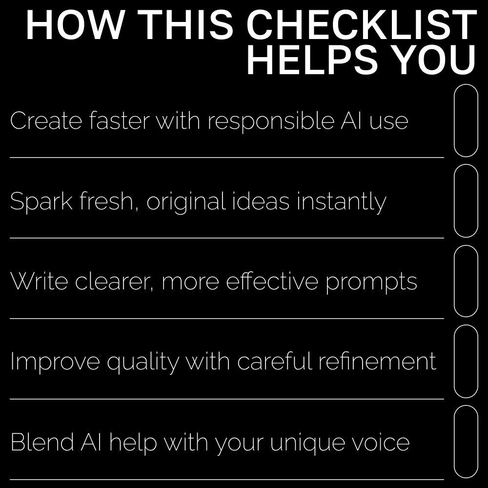 Unlike generic AI guides, this resource combines ethical considerations, practical boundaries, and real creative application in one easy-to-use checklist. It’s not just about using AI—it’s about using it well, with intention and integrity.