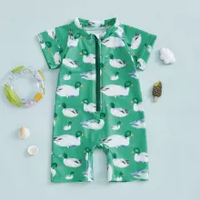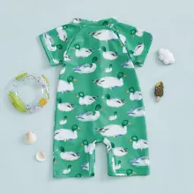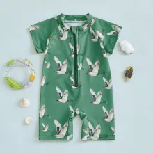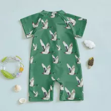 Make a splash this summer with our Wild Duck Print Toddler Rash Guard Swimsuit — the perfect blend of playful design and all-day comfort. Designed for active little ones, this zip-up short sleeve swimsuit is a must-have for beach days, pool parties, or backyard water play. Featuring a charming green base and cheerful duck print, it adds fun to every swim while keeping your baby comfortable and cute.